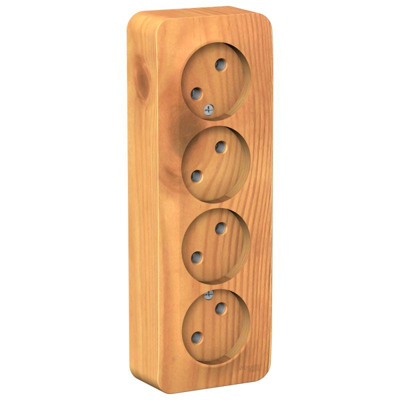 Розетка Systeme Electric (ранее Schneider Electric) BLANCA (ясень, открытой установки) четырехместная, без шторок и заземления, с изолирующей пластиной предназначена для сетей до 250В, на ток до 16А. четырехместная розетка позволяет подключить четыре устройства в одном месте. Изделия цвета Ясень обладают уникальным рисунком, напоминающим древесный сруб. Она изготовлена из ABS-пластика, проста в установке и удобна в применении.