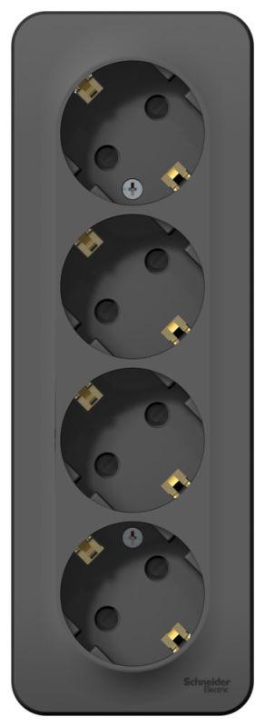 Розетка Systeme Electric (ранее Schneider Electric) BLANCA (антрацит, открытой установки) четырехместная, с заземлением, шторками и изолирующей пластиной предназначена для сетей до 250В, на ток до 16А. Четырехместная розетка позволяет подключить четыре устройства в одном месте. Шторки и заземление обеспечивают дополнительную безопасность при косвенном прикосновении.