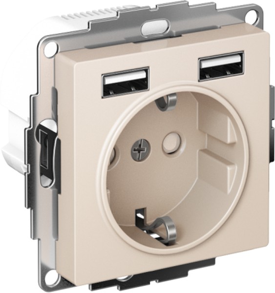 Розетка силовая Systeme Electric (ранее Schneider Electric) серии AtlasDesign 16А (цвет бежевый) с заземлением и шторками с розеткой USB, с друмя разъемами типа А