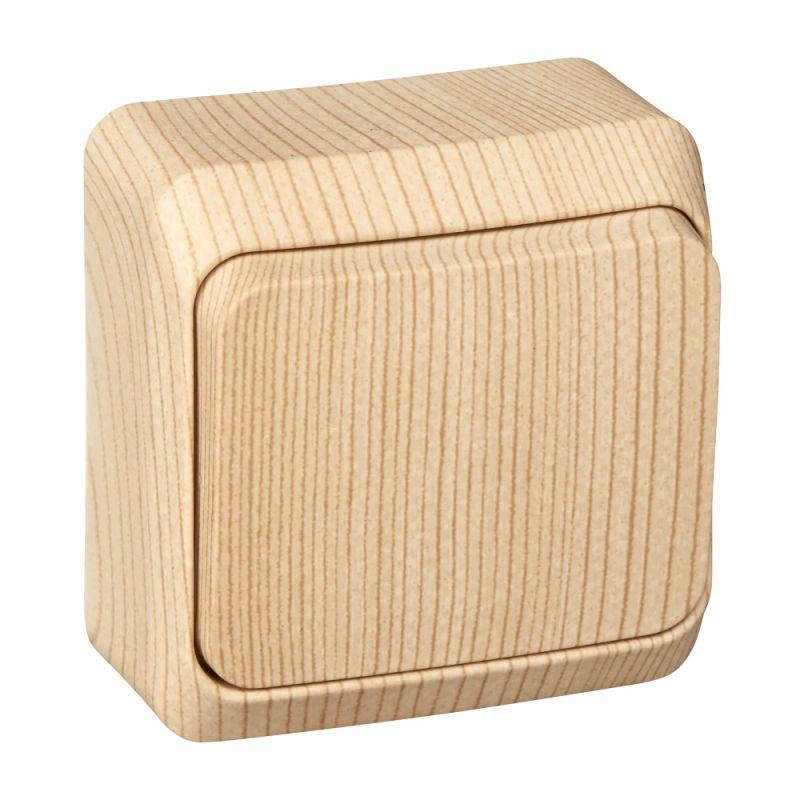 Выключатель Systeme Electric (ранее Schneider Electric) ЭТЮД (сосна, открытой установки) одноклавишный предназначен для применения в сетях до 250В, на ток до 10А. Выключатель подходит для большинства типов ламп, включая люминесцентные. Изделия цвета Сосна обладают уникальным рисунком, напоминающим древесный сруб. Он прост в установке и удобен в применении. Сделано в России.