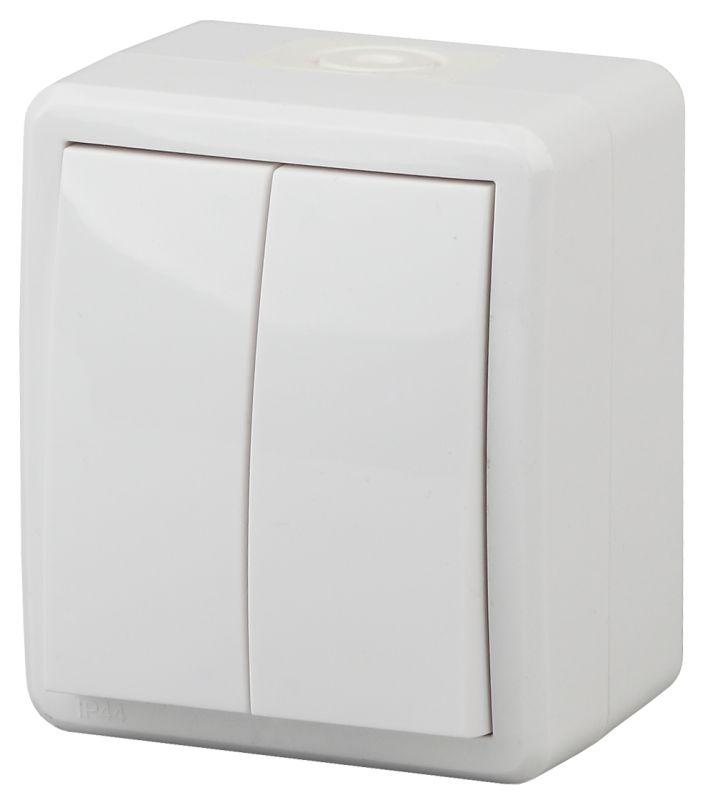 Выключатель влагозащищённый IP54 2-клавишный серии Эра Эксперт открытой уст. цвет белый 11-1404-01. Номинальные характеристики . Выключатель выполнен из качественного поликарбоната, оснащён уникальными винтовыми клеммами ЭКСПЕРТ для максимально качественного зажима кабеля в механизме.