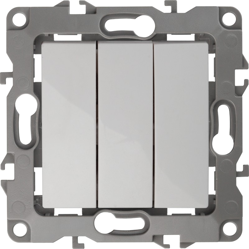 Выключатель 3-клавишный серии Эра 12 скрытой установки механизм цвет белый 12-1107-01. Номинальные характеристики 10А 250В . Сделан из поликарбоната, оснащён винтовыми уникальными клеммами ЭКСПЕРТ для надёжной фиксации жил кабеля в механиме. Парные клеммы обеспечивают соединение шлейфом. Монтаж в подрозетник производится и на лапки, и на винты. Рамки приобретаются отдельно.