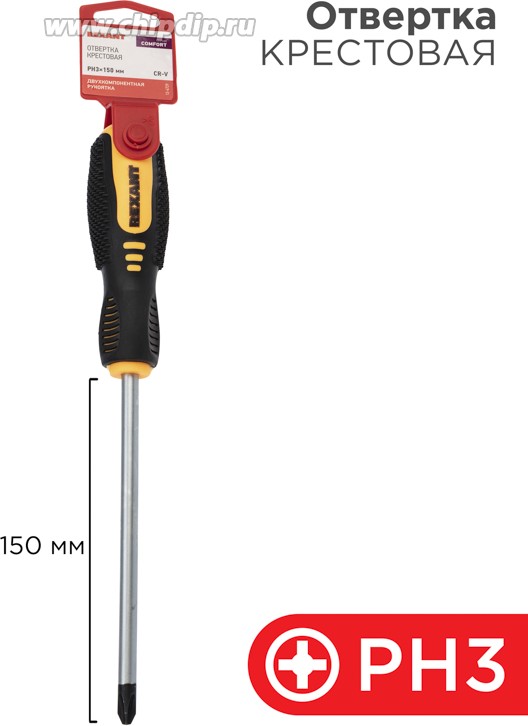 Отвертка PH3х150 мм REXANT предназначена для монтажа/демонтажа крепежных соединений.