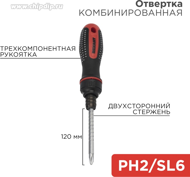 Отвертка реверсивная комбинированная двухсторонний стержень 120мм (крестовая PH 2 шлицевая SL 6 мм)