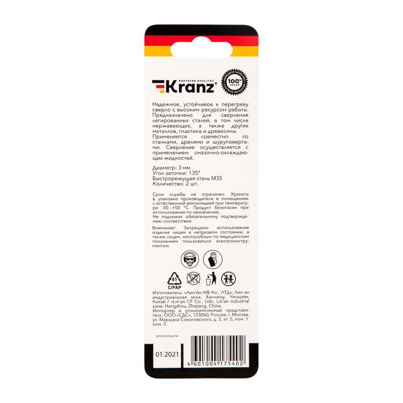 Сверло по металлу 3мм “Кобальт” (сталь HSS-Co 5% M35 P6M5K5) DIN 338 (блист.2шт) Kranz KR-91-0502