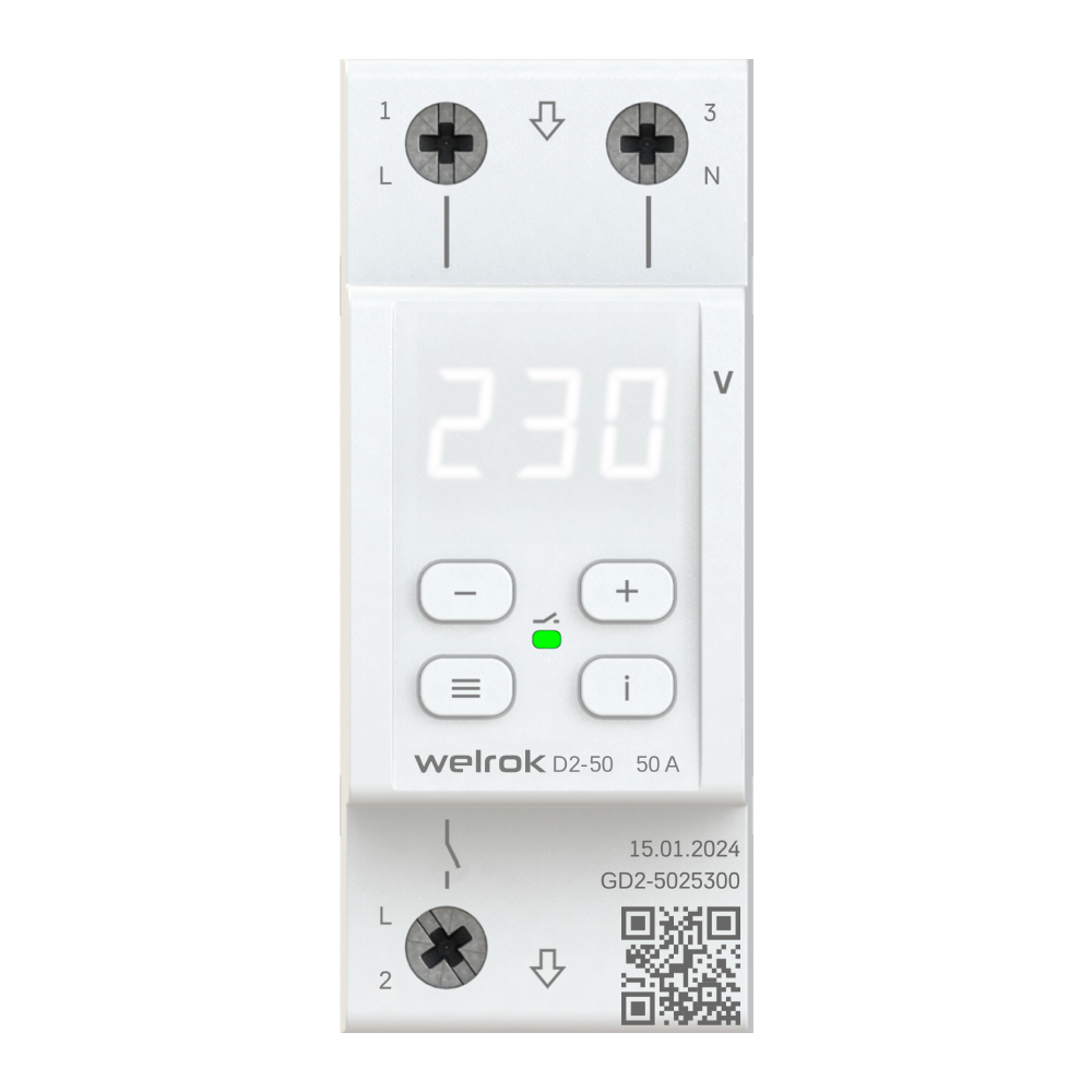 Реле напряжения Welrok D2 защищает оборудование от скачков и провалов напряжения, обрыва нулевого провода. Реле отключает нагрузку, если сетевое напряжение выходит за установленные пределы. Когда значение напряжения вернется в норму, нагрузка будет автоматически включена обратно.
