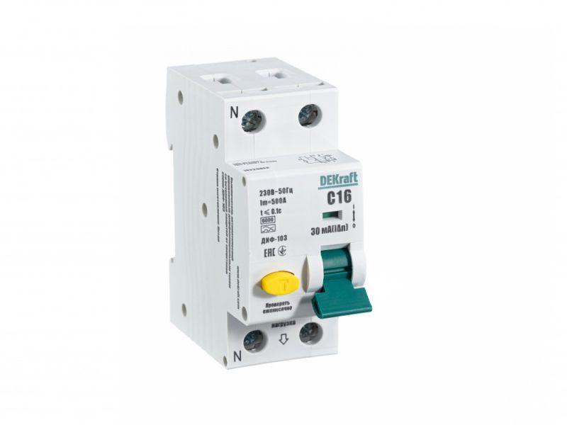 Автоматический выключатель дифференциального тока серии ДИФ-103 DEKraft; 1P+N; ном.ток 16 А; характеристика C; откл.способность Icn = 6 kA; ток утечки 30 мА; тип – А; блок дифф.защиты – электронный; ширина – 2 мод. х 18 мм; монтаж – на DIN-рейку. АВДТ применяются в сетях напряжением до 220 В пер.тока для защиты человека от поражения электрическим током и электроустановок от сверхтоков и токов утечки. Аппараты ДИФ-103 являются более компактным вариантом АВДТ по сравнению с серией ДИФ-101.