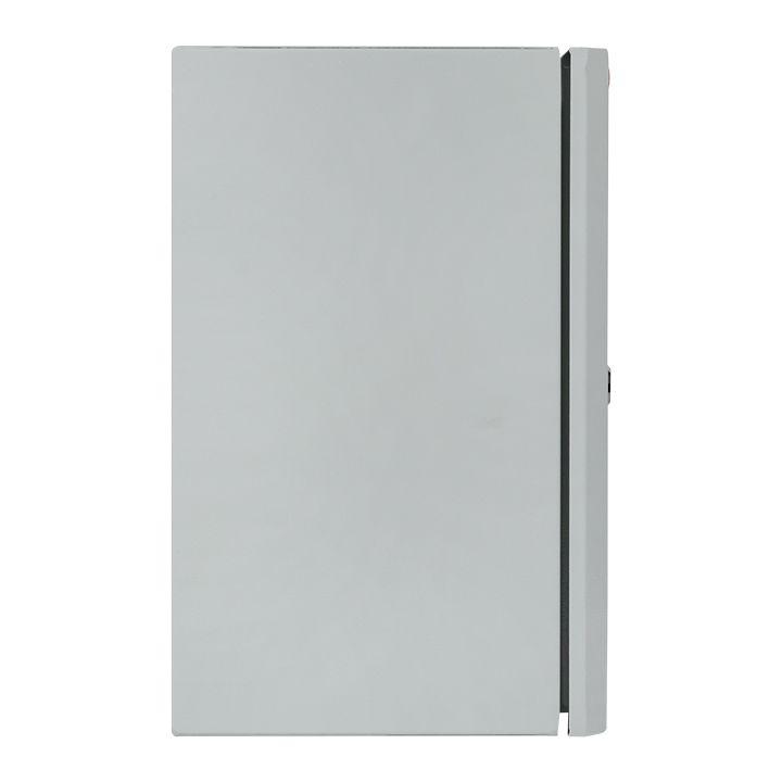 Навесной, с дверцей и замком. Предусмотрена монтажная панель. Изготовлен из стали, покраска серого цвета. Размеры: 400 х 300 х 220 мм. Защищен от проникновения пыли и влаги (IP54).