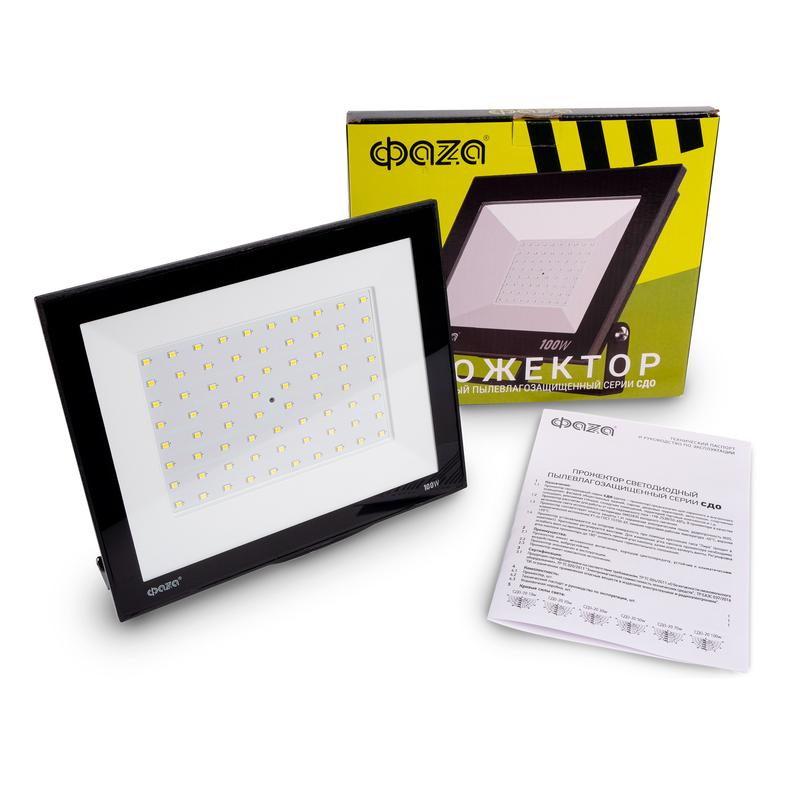 Прожектор светодиодный СДО-20 100Вт 6500К IP65 230В BL ДО прозр. закален. стекло ФАZА 5047341