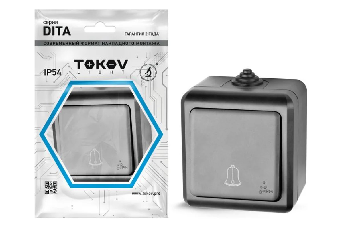 Кнопка звонка ОП Dita IP54 10А 250В карбон TOKOV ELECTRIC TKL-DT-DB-C14-IP54